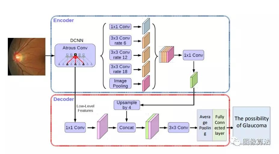作者将DeepLab + 3修改为分类器,将最后一层替换为全局平均池化层,然后再替换为完全连接的层,以预测青光眼的风险可能性。DeepLab + 3包含一个编码器和一个解码器。编码器将无用的空间金字塔池(ASPP)和卷积嵌入级联,以提取各种比例上下文上下文像素信息。解码器拒绝通过无意识卷积和编码器的各种比例上下文特征学习到的低级特征。