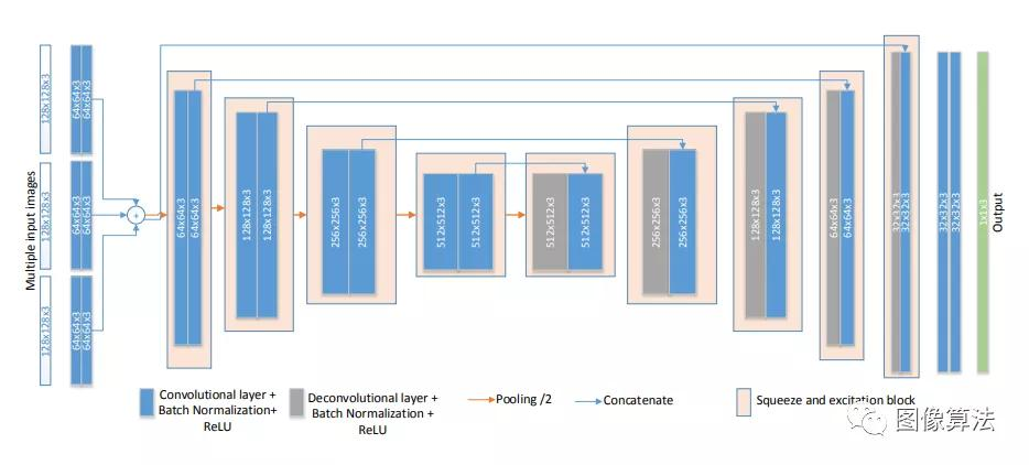作者采用类似于u-net 的架构来学习不同的像素级功能。我们将u-net修改为具有多个输入(本例中为3个)可以在训练期间接收更多原始的原始像素信息。这种策略可以减少过度安装的风险,并增强网络的学习能力。我们将此架构称为X Unet。此外,我们将挤压和激励块嵌入到我们的X-Unet中,以加权来自不同卷积层通道的特征。利用一种机制,允许网络选择性地放大有价值的通道功能,并从全局信息中抑制无用的功能。另外,我们在网络解码器部分使用反卷积,通过拒绝不同级别编码特征和相应级别解码特征之间的特征来改进解码能力。下图图显示了我们的X-Unet的体系结构。