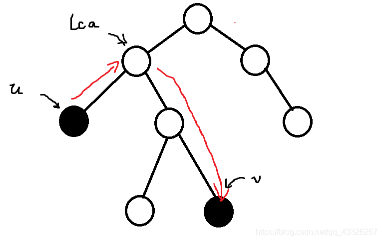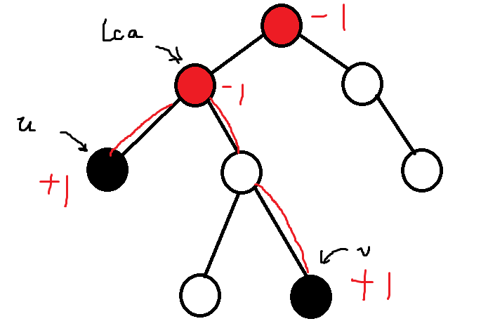 那么这条路径上的点权都要+1。一般树上的操作都是要dfs到底然后回溯操作的,所以结合查分的思想,我们可以设一个查分数组tot,然后tot[ u ]++,tot[ v ]++;这样一来就表示自下而上从u、从v开始多了一层覆盖;很明显在两点的lca处重复覆盖了一层,所以要tot[ lca ]--;当然这层覆盖是要去掉的,我们还要在tot[ fa[ lca ] ] --。也就是: