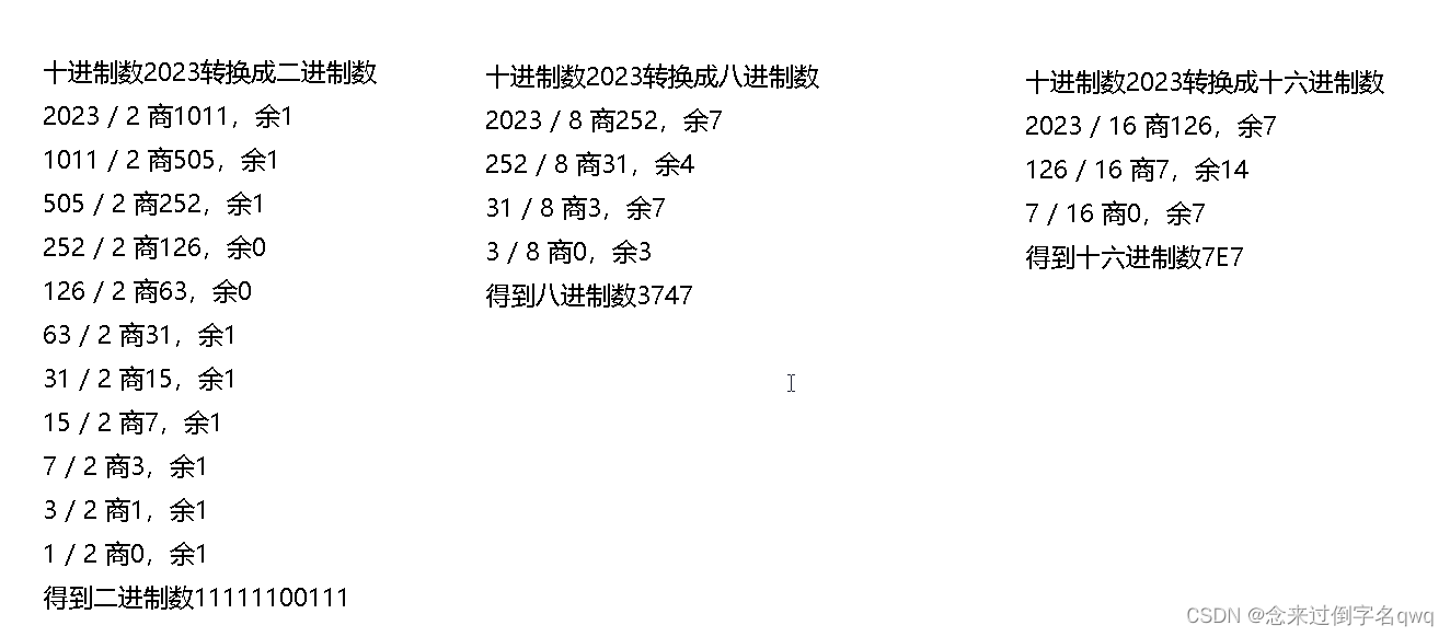 那么用这个方法将十进制数除以相应基数,得到商和余数,不断用商除以基数直到商为0,余数倒着读就能得到转换后的进制数值。