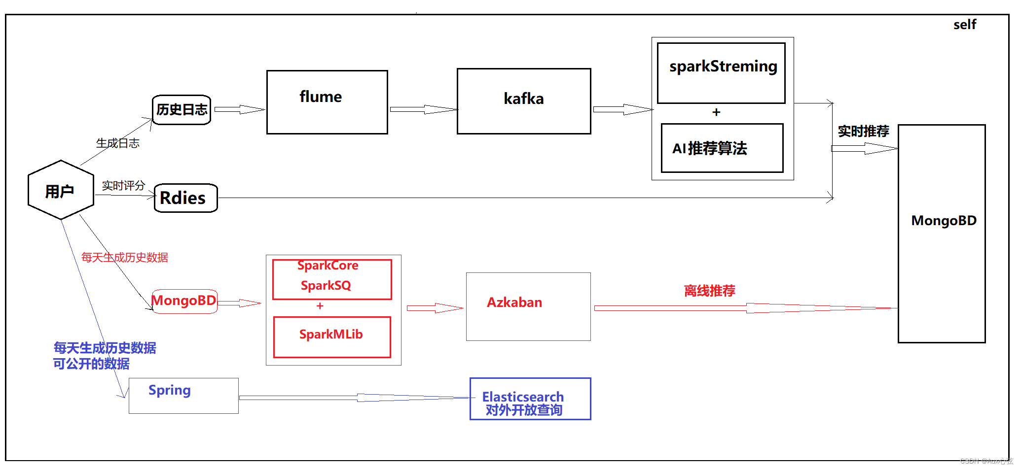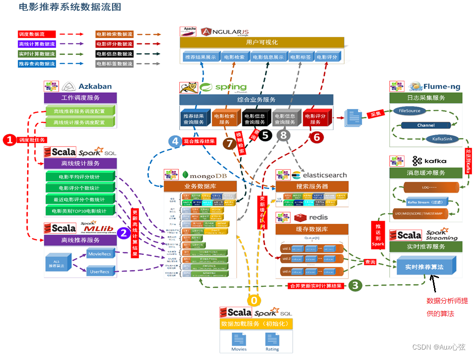 | 1)影片推荐系统: [2] 技术架构:Flume+Kafka+SparkStream+SparkMLib+Redis+MongDB+Elasticsearch+Azkaban [3] 开发工具:IntelliJIDEA+Xshell [4] 项目描述:面对海量用户观看的电影记录,需要从中快速推荐送给符合用户兴趣的电影观看。 [6] 原始数据:Movie、Rating和Tag的数据表名。 [7] 技术实现: ▪离线分析:SparkCore+SparkSQL对MongDB历史数据进行开发评分统计、按月统计、类型统计和电影top; ▪离线推荐:SparkCore+SparkMLib,结合ALS算法对MongDB历史数据开发"用户未看电影表"和"相似电影表"; ▪离线调度:Azkaban定期更新离线推荐"户未看电影表"和"相似电影表"; ▪实时采集:Flume用户日志进行采集,实时推送至Kafka集群; ▪实时缓冲:Kafka作为流数据缓存,接受Flume推送请求,并将数据再次推送于实时推荐系统; ▪实时推荐:SparkStreaming作为实时推荐系统,接收Kafka缓存数据和Redis内的用户实时评分记录, 并结合"相似电影表",通过分析师提供的算法开发"推荐优先级电影表"; ▪实时查询:MongDB和Elasticsearch对外提供查询服务 |