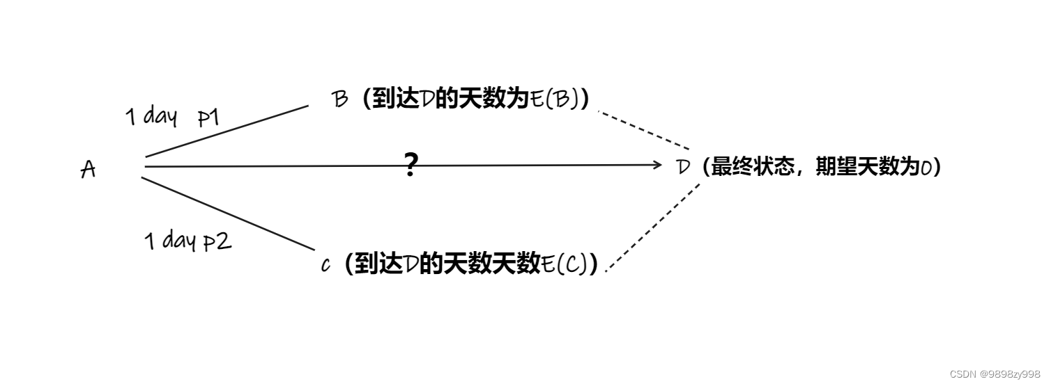 问A到D的期望时间,所以E(A)=1+p1*E(B)+p2*E(C);