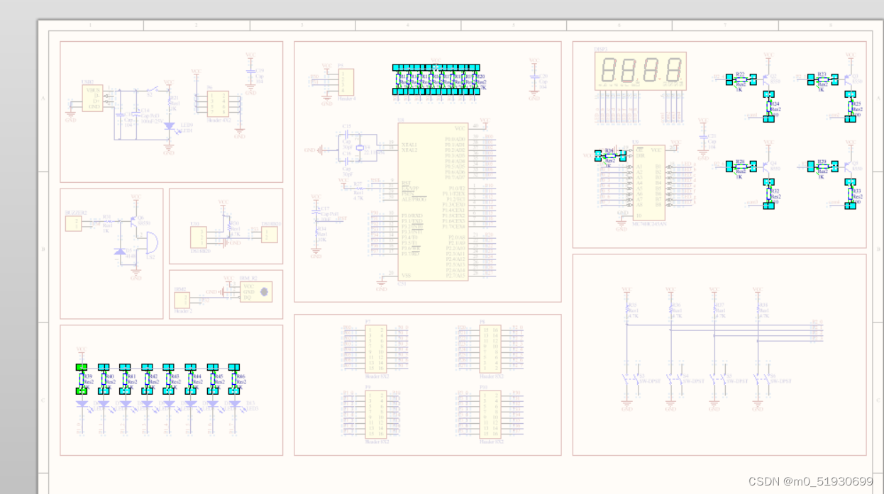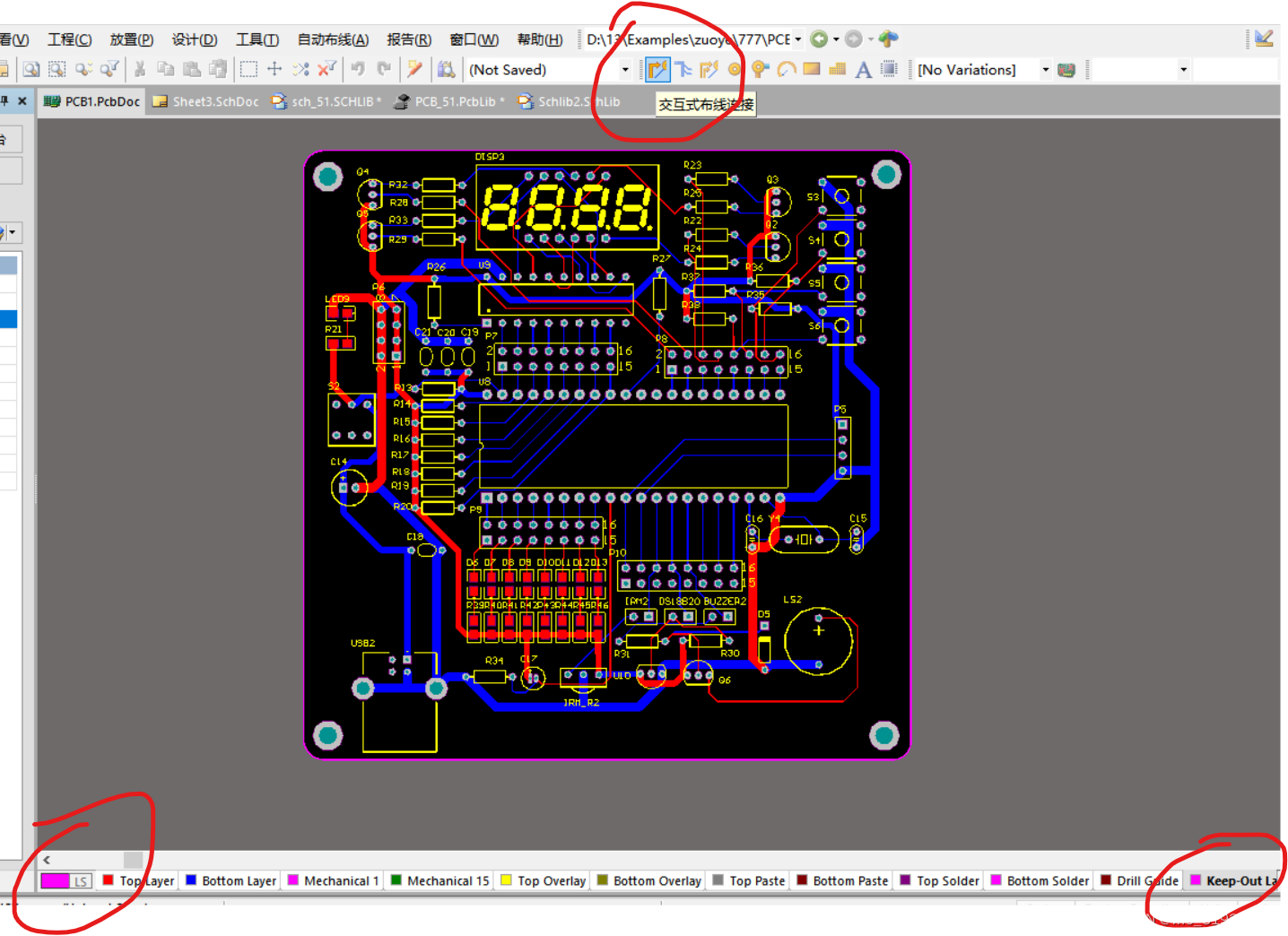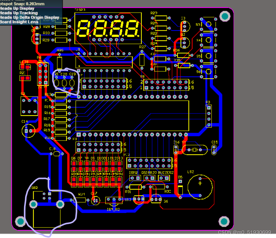 实验中遇到的问题:原理图中掉了vcc,然后绘制之后,再在pcb中重新执行生成一下,将将红色的框给删掉,器件的显示绿色就会没有。数码管画的是一个反向的,所以将数码管调整了一下。