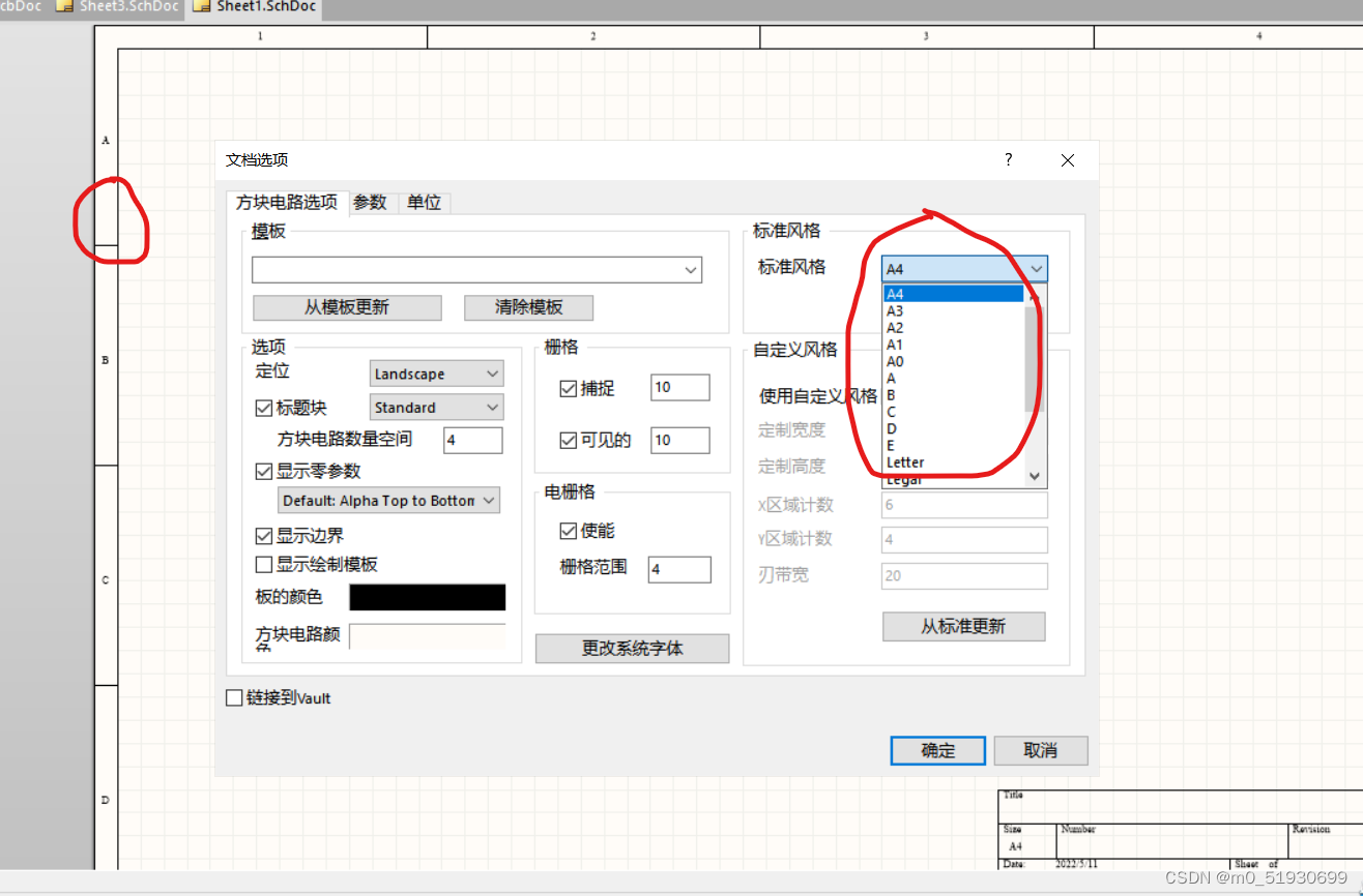 鼠标双击边角会跳出一个框,就可以切换原理图纸的大小,由于我们要绘制的是51单片机所以这里选择A4纸大小