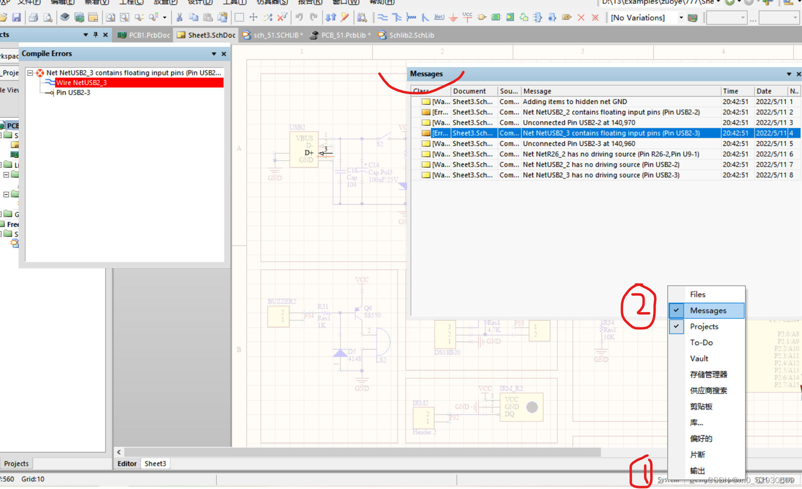本次实验我们用到的原理图库就是图中的三种,2、3库是软件自带的,大部分的元器件都在这两个库里找。