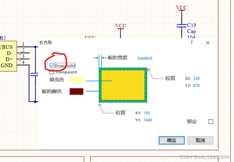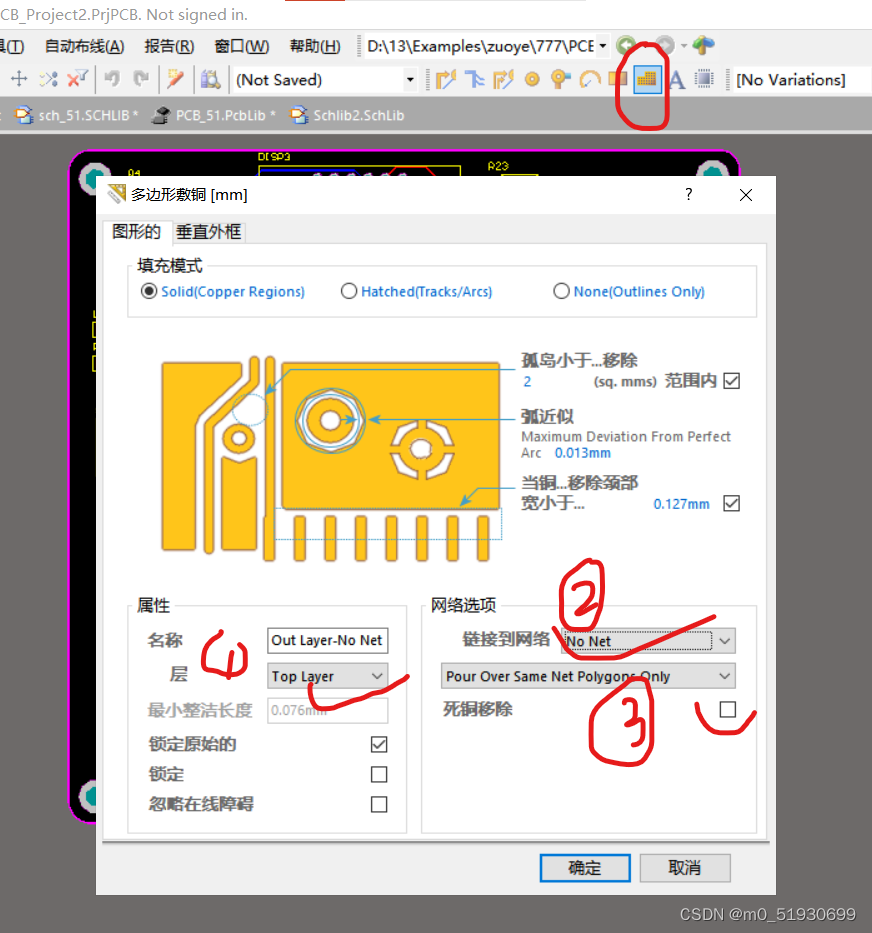 给pcb敷铜,在①处选择top layer/bottom layer,在②处选择GND,最后将3处勾选上,然后分别给顶层和底层敷铜