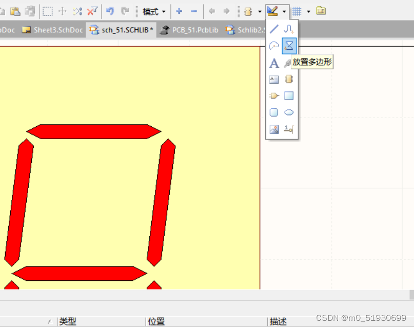 绘制数码管上的数字是选择放置多边形,然后选中之后点击一下鼠标右键,然后按Tab键,将线型改成最小线性,然后画出大体结构最后填充图像,将改线复制粘贴,通过空格键、X和Y键进行旋转翻移,再进行操作时一定是要将鼠标长按着的,而且要选中器件。