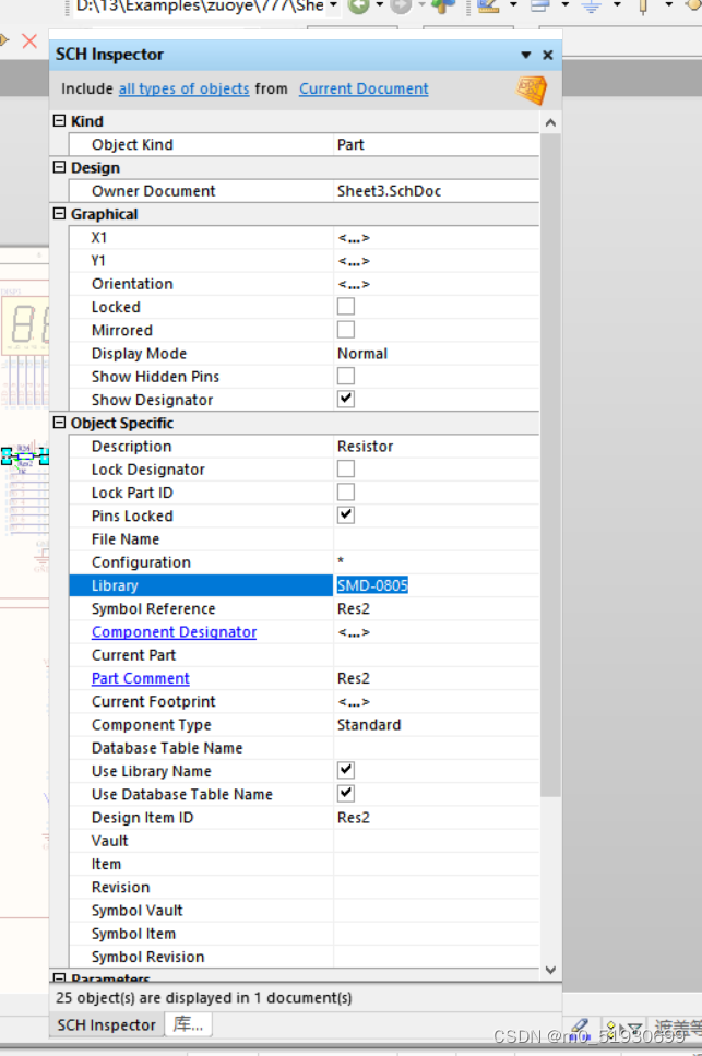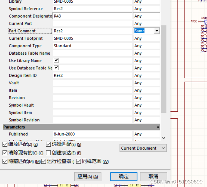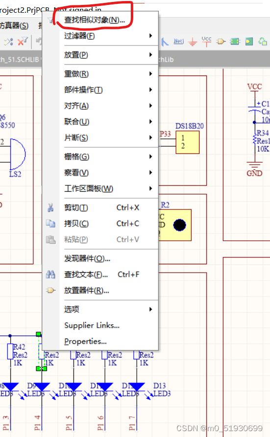 封装库画好后,就开始批量修改器件的封装,有一些封装是软件中有的,然后我们需要将自己的封装放入器件中,可以一个一个器件的更改封装,不过这样太麻烦了,可以观察器件的属性,然后通过共同点进行封装的批量置换,如更换电阻的阻值,点击鼠标右键查找相似,通过表中可知Res2的电阻大部分封装都是RES1.2可以直接先将Res2的所有电阻都改成RES1.2,对于其他部分就再根据共同点修改,最后enter键确定设置