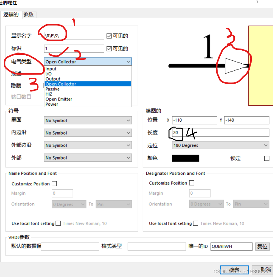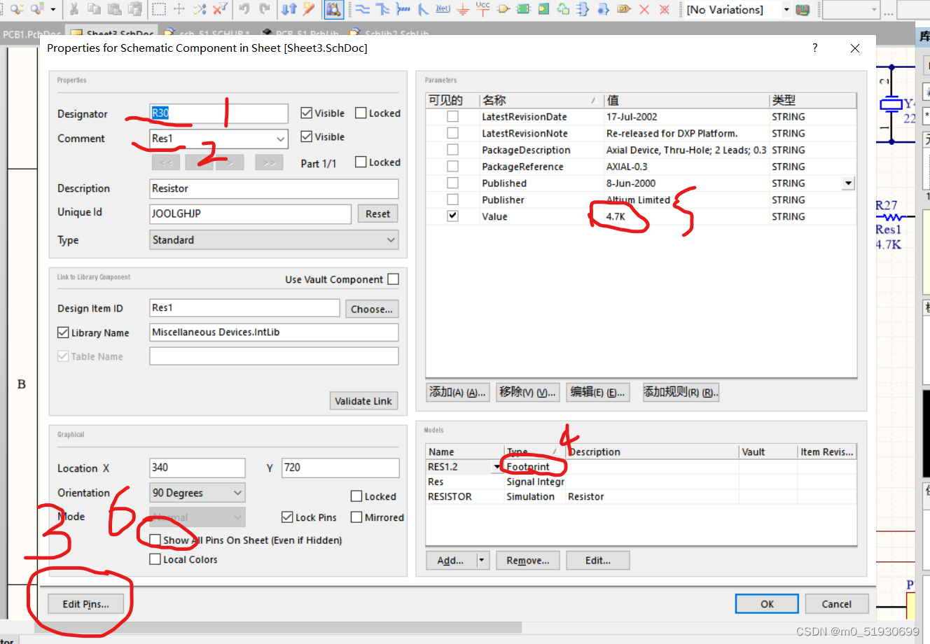 1是器件的标识,每一个器件的标识都要不同,在5的地方改器件的参数,4的地方双击可以更改器件的封装,6可以显示器件的引脚,3可以修改器件的引脚。