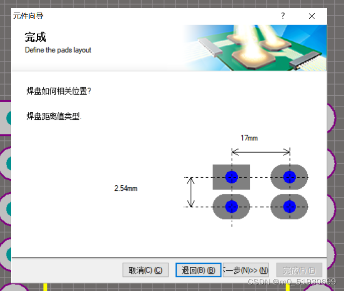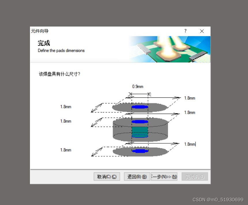 对照芯片引脚,将焊盘大小进行修改,利用以下①②③的参数来对焊孔的大小进行修改,大于0.559小于1.04,所以选取0.9(选取较大一点会比较容易将管脚插入孔洞中),然后另一个参数是其孔的2倍比较好,所以选取1.8,对比③中1.8小于2.29,所以1.8这个参数可以。参数设置如下图所示,设置完成后,点击下一步
