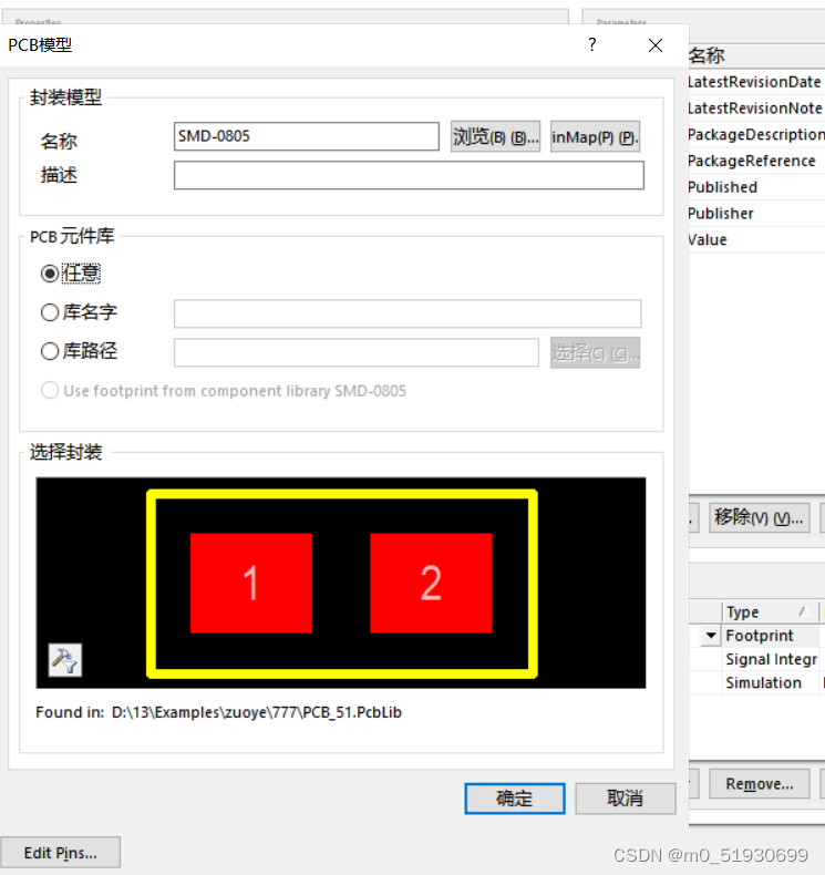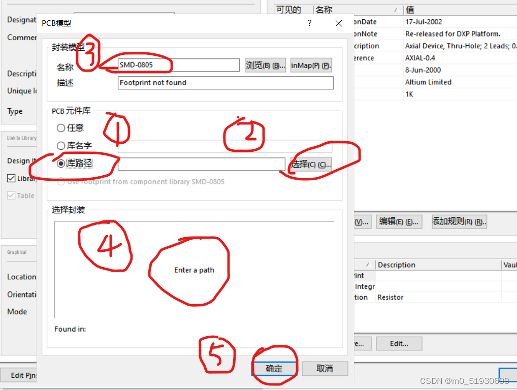 对于其他的封装,双击上述提到过的footprint,然后出现状态栏,按图示步骤操作②中找到自己的封装库,在③处将自己的封装名称打进去,④中会出现封装的图像,我这里没有出现,因为我的封装库已经保存在系统中的封装库中,所以在任意键中就可以看到,最后点击完成。