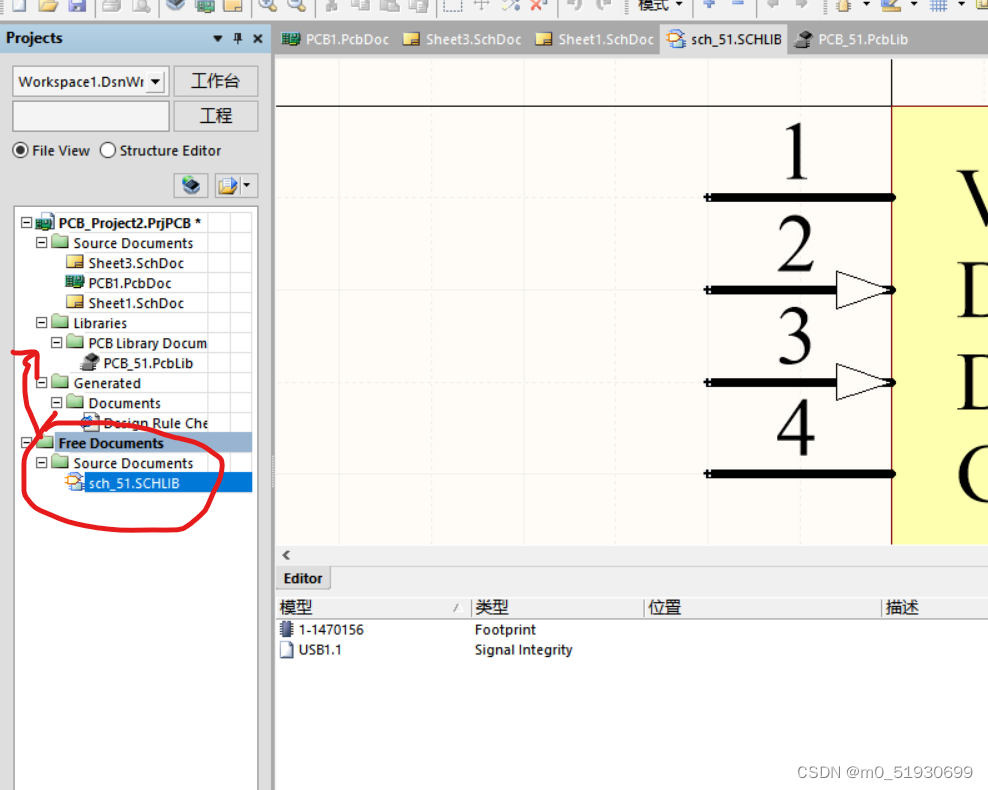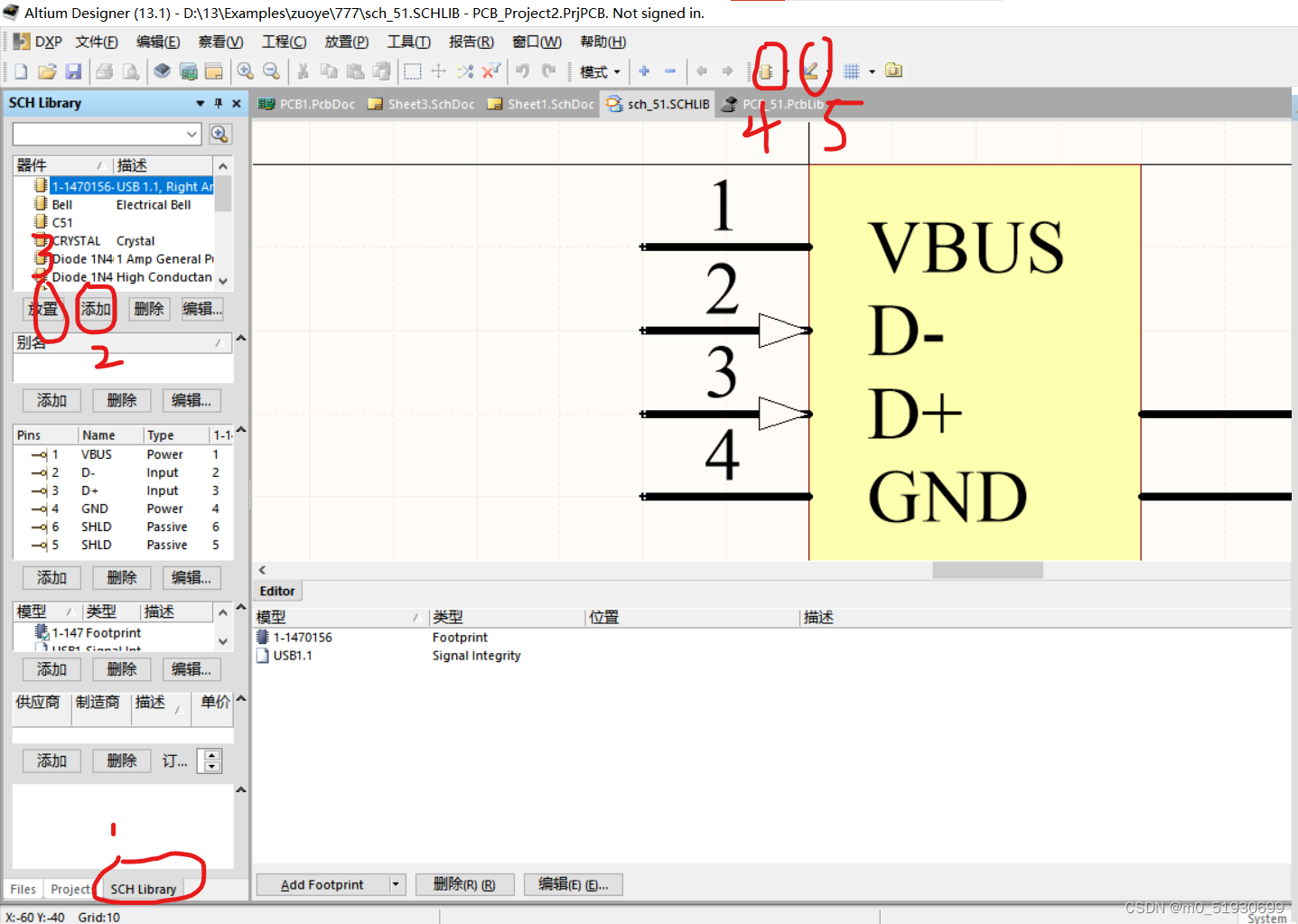 如下图1进入原理图库,点击2添加,添加一个元器件的原理图,3是将该元器件放置在原理图中)例如画51单片机的原理图,点击5,点击绘制矩形框,然后将框绘制成合适的大小。可以通过按住ctrl键利用鼠标调节视野的大小。再点击5放置引脚,在放置引脚前可以先按tab键,对引脚名称、引脚号、引脚类型和引脚长度进行修改,同时tab键后的设置,系统就会自动对引脚号进行向下排序。每个字符之间用“\”符号隔开就会显示出低电平有效的标识。