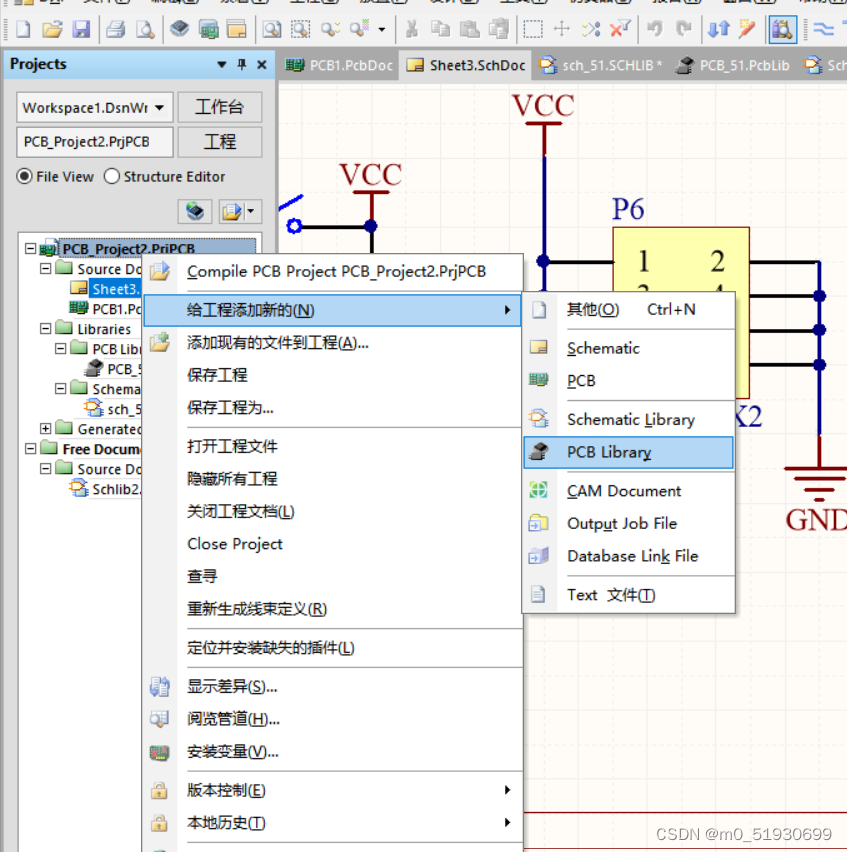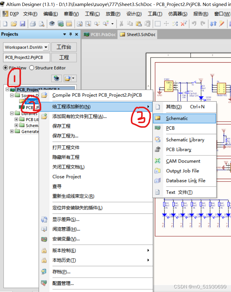 在左侧的状态栏的pcb工程右击→给工程添加新的→Schematic