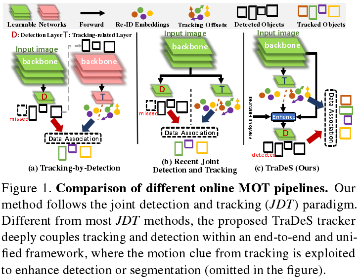 联合检测和跟踪。最近,联合检测和跟踪范式由于它的高效和标准话的框架引起大家注意。一种普遍的方式是,在检测器上构建一个跟踪相关分支用来预测,而不是将目标跟踪偏移量或者re-id嵌入特征进行数据关联。此外,transformer已经被用来做跟踪匹配。CTracker在每两帧中通过连接成对的boxes构建跟踪轨迹。TubeTK以离线学习方式直接预测一个box tube作为跟踪轨迹。然而大多数联合检测跟踪方法中,都存在两个问题:第一,检测部分没有从跟踪部分得到任何有效帮助,依旧独立预测。第二,在联合训练中re-id损失函数与检测损失函数指标不相同。相反,在我们的TraDeS中通过将合并跟踪信息反馈给跟踪器,并且设计一个新颖的re-id嵌入学习方案来解决以上两个问题。