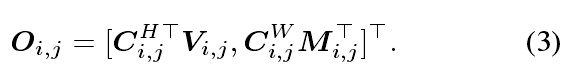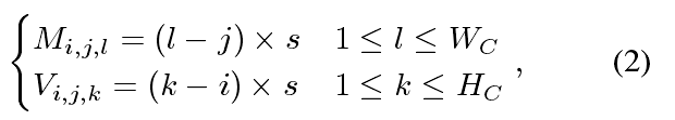 如图2所示,一个目标在 t 时刻的中心点是(i, j),我们可以从C中得到与它相关响应点的2维cost volume map Ci,j ∈ RHC×WC。Ci,j 保存了在目标x 和所有点在 t-τ 时刻匹配相似度。 通过两步来估算Ci,j, Oi,j ∈ R2:第一步,首先使用HC × 1 和 1× WC的卷积核进行最大池化操作得到Ci,j,然后使用sofrmax进行标准化,最后得到的结果是,CWi,j∈ [0, 1]1×WC 和 CHi,j∈ [0, 1]HC×1。CWi,j∈ [0, 1]1×WC 和 CHi,j∈ [0, 1]HC×1 是相似度矩阵,也就是说,目标x 在 t-τ时刻 特殊的 水平和垂直位置。第二步,由于CWi,j∈ [0, 1]1×WC 和 CHi,j∈ [0, 1]HC×1 提供了目标x在t-τ时刻特殊位置的相似度,为了获得最后的偏移量,我们预先确定在水平和垂直方向上的两个偏移模板,当目标x出现到其他位置时标明其真实的偏移值。使用Mi,j ∈ R1×WC 和 Vi,j ∈ RHC×1 分别表示目标x在水平和垂直距离上的偏移模板,其计算如下: