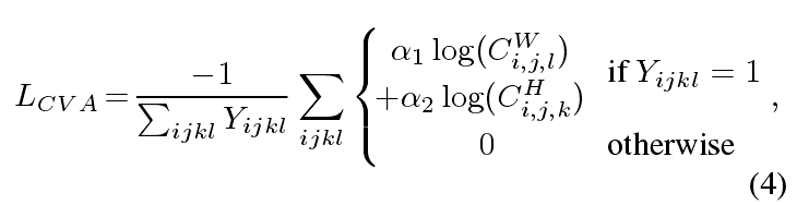 在上个式子中,α1 = (1 − CWi,j,l)β 而 α2 = (1 − CHi,j,k)β。β是focal loss 的超参。因为CWi,j,l 和 CHi,j,k 通过softmax计算出来,他们包含的嵌入相似度不仅在点(i, j)和(k, l)之间,而且还包含了点(i, j)和之前帧的所有其他点。这也就是说,当CWi,j,l 和 CHi,j,k 被优化到接近1时,当增强一个对象时,不仅使得其接近之前帧,而且还抑制其他目标和背景区域。