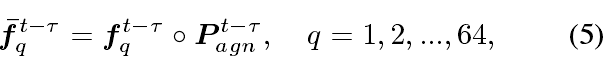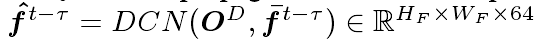 上式中,q是通道下标,◦是哈达玛积, Pt−τagn∈ RHF ×WF ×1 是从 Pt−τ(定义在第三部分)得到的无类热图。然后从得到的OD 和 ¯ft−τ,传播特征通过DCN计算方式如下:
