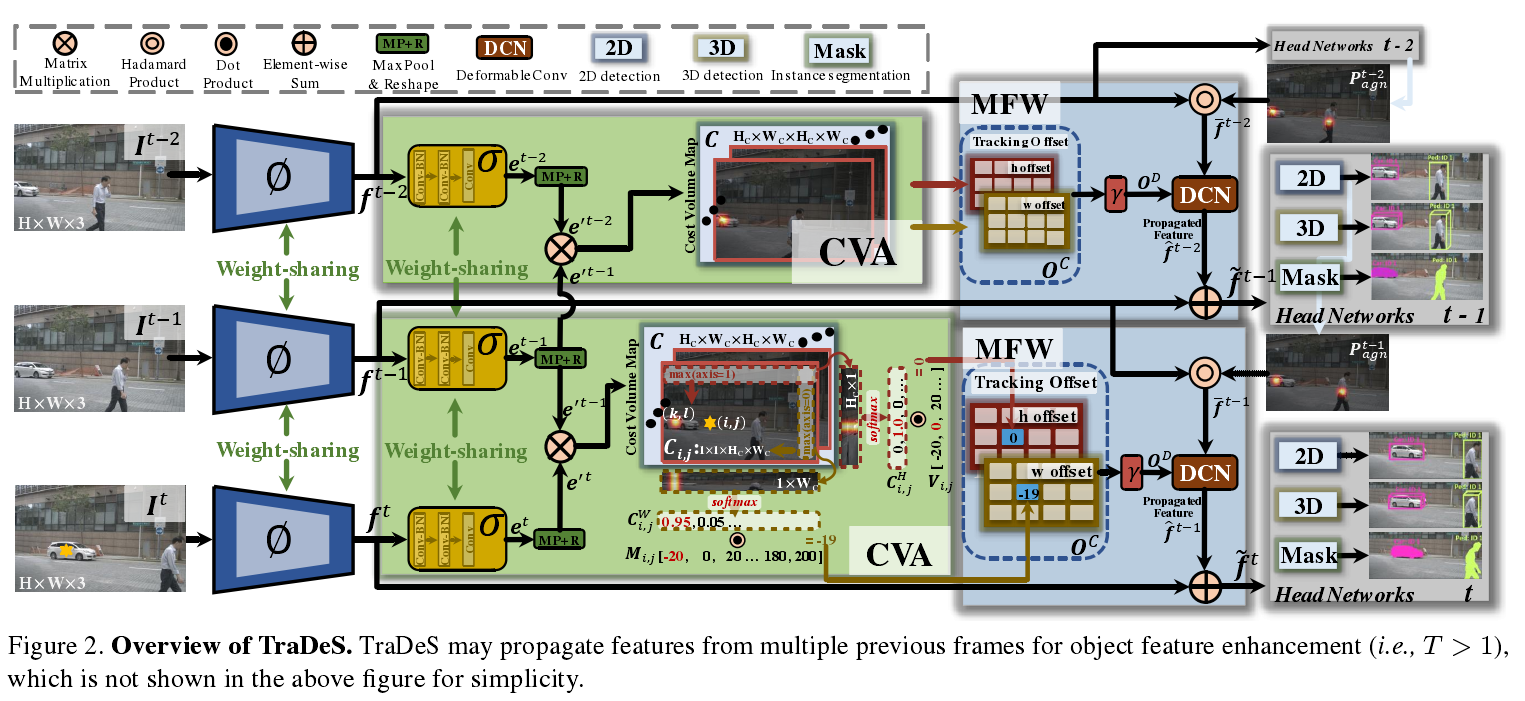 本论文,我们提出新的在线检测和跟踪模型,称为TraDeS(TRAck to DEtect and Segment)。在TraDeS中 ,与CenNet类似,每个特征图谱中的点要么表示目标中心点要么表示背景区域。TraDeS在此之上提出两个问题, 不但通过紧密地将跟踪器与检测器联合在一起,还专门设计了一个re-id学习方案。我们提出分别基于关联模型(CVA)的代价量和动态导向特征弯曲(MFW)模型。关联模型通过骨干网络逐点提取re-id嵌入特征来构造代价量,这个代价量存储了匹配两帧中相似的嵌入对(嵌入特征对)。然后,我们还根据代价量提出跟踪偏移,这是所有点在时间和空间的位移。例如,在前后两帧中,目标可能存在的中心。跟踪偏移量将所有特征整合用于进行一个简单的两轮长时间数据关联。接着,MFW将跟踪偏移量作为动态信息从前一帧将目标特征传播到当前帧。最后,这个传播了的特征和当前帧的特征合并后进行检测和分割。