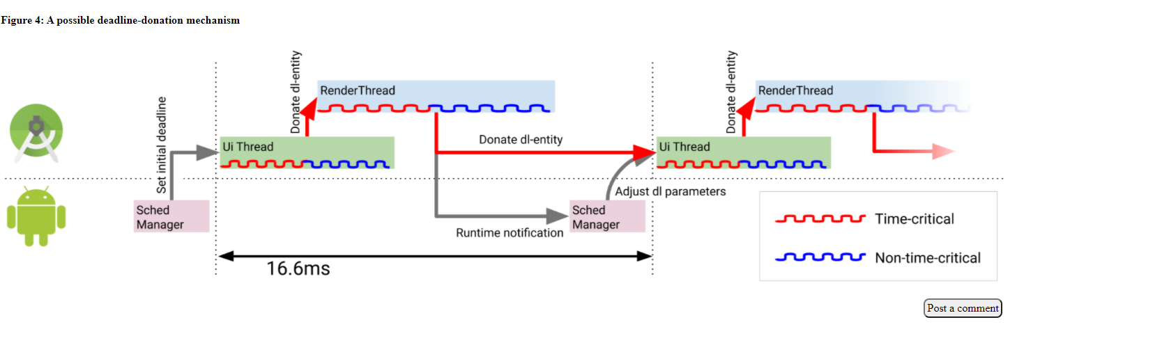 该解决方案可以通过使用交换两个任务的调度属性的令牌传递机制扩展调度程序API来实现。甲SCHED_DEADLINE它通过绘制指令列表后UI线程可以捐赠其内部调度参数,以RenderThread,和RenderThread可以给回SCHED_DEADLINE令牌到UI线程。