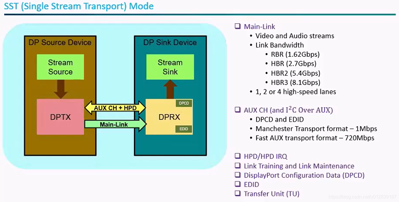 介绍配置和管理协议,数据的传输[host->display]转发传输通道以及辅助双向通道,包括SST[single steam transport]以及MST[multi-stream transport]