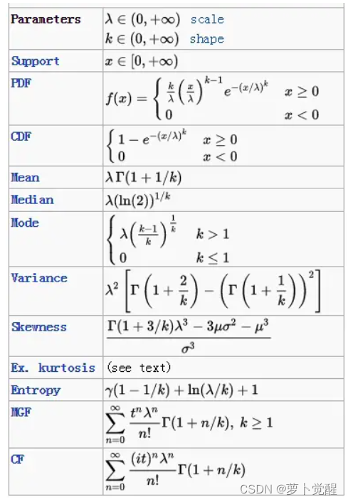 Weibull distribution与很多分布都有关系。如,当形状参数为k=1,它是指数分布;k=2且时,是Rayleigh distribution(瑞利分布)