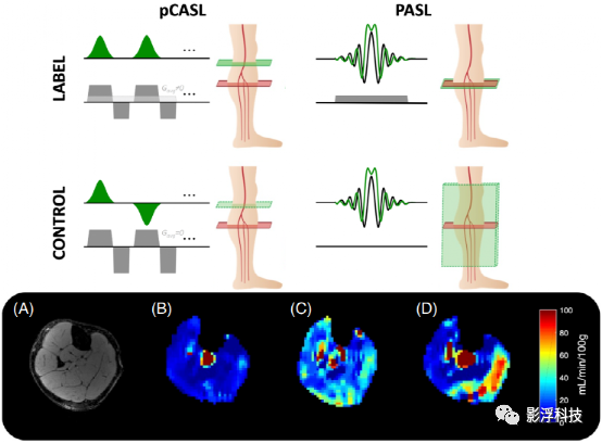 图10 PCASL和PASL标记方法示意图。健康志愿者骨骼肌的解剖图像(A),静息(B)、诱导缺血后(C)和足底屈曲运动后(D)的灌注图像。