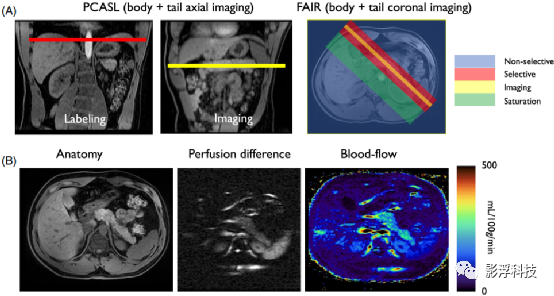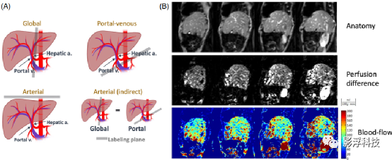 图7 (A)用PCASL序列测量肝脏全灌注、门静脉灌注和动脉灌注的标记方法示意图。(B)解剖像、灌注加权像和定量肝血流图像。