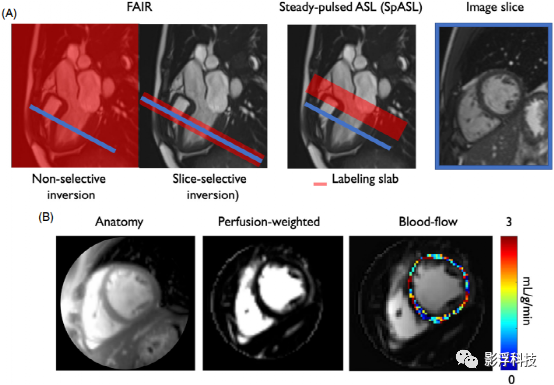 图6 (A)心肌FAIR和稳定脉冲ASL的标记示意图。(B)健康志愿者3 T下使用FAIR-bSSFP序列得到的解剖、灌注加权和定量心肌血流结果。