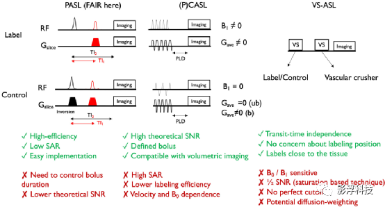 图1 FAIR、PCASL和VS-ASL三种方法的原理图及优缺点。