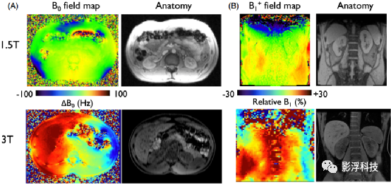 ASL对静磁场(B0)和射频场(B1+)的不均匀性较为敏感(图2),这会导致图像失真,降低标记效率。B0不均匀性来源于空气,主要出现在肺泡和肠道中;B1+不均匀性取决于身体的几何形状以及组织构成,心脏、肾脏和乳房处较为严重。