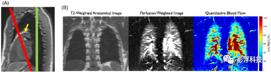 图4 (A)PCASL标记平面(红色)位于肺动脉主干上方,冠状位成像定位(浅绿色)用于肺灌注成像。FAIR标记平面和成像平面位于浅绿色处。(B)健康志愿者3 T下FAIR-SSFSE序列结果。