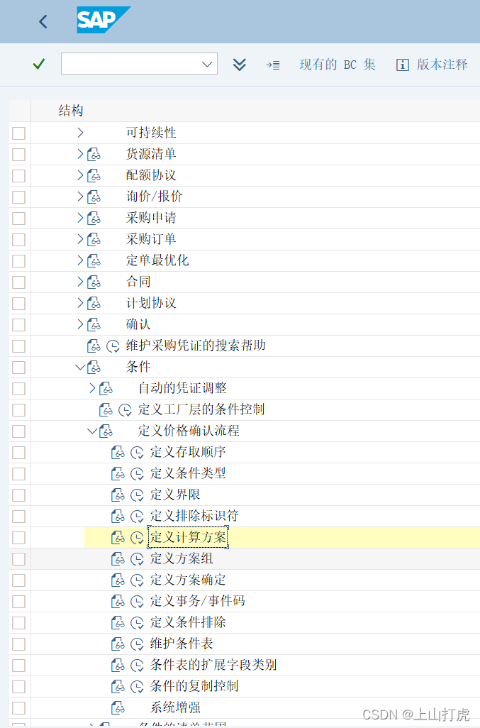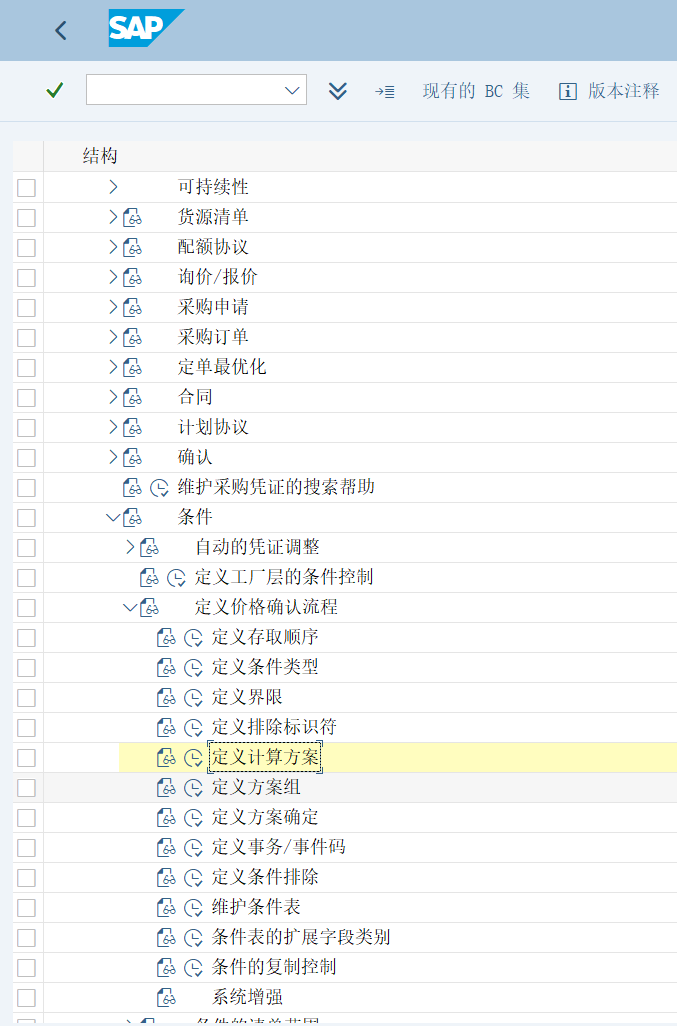 然后进SPRO-物料管理-采购-条件-定义价格确认流程-定义计算方案