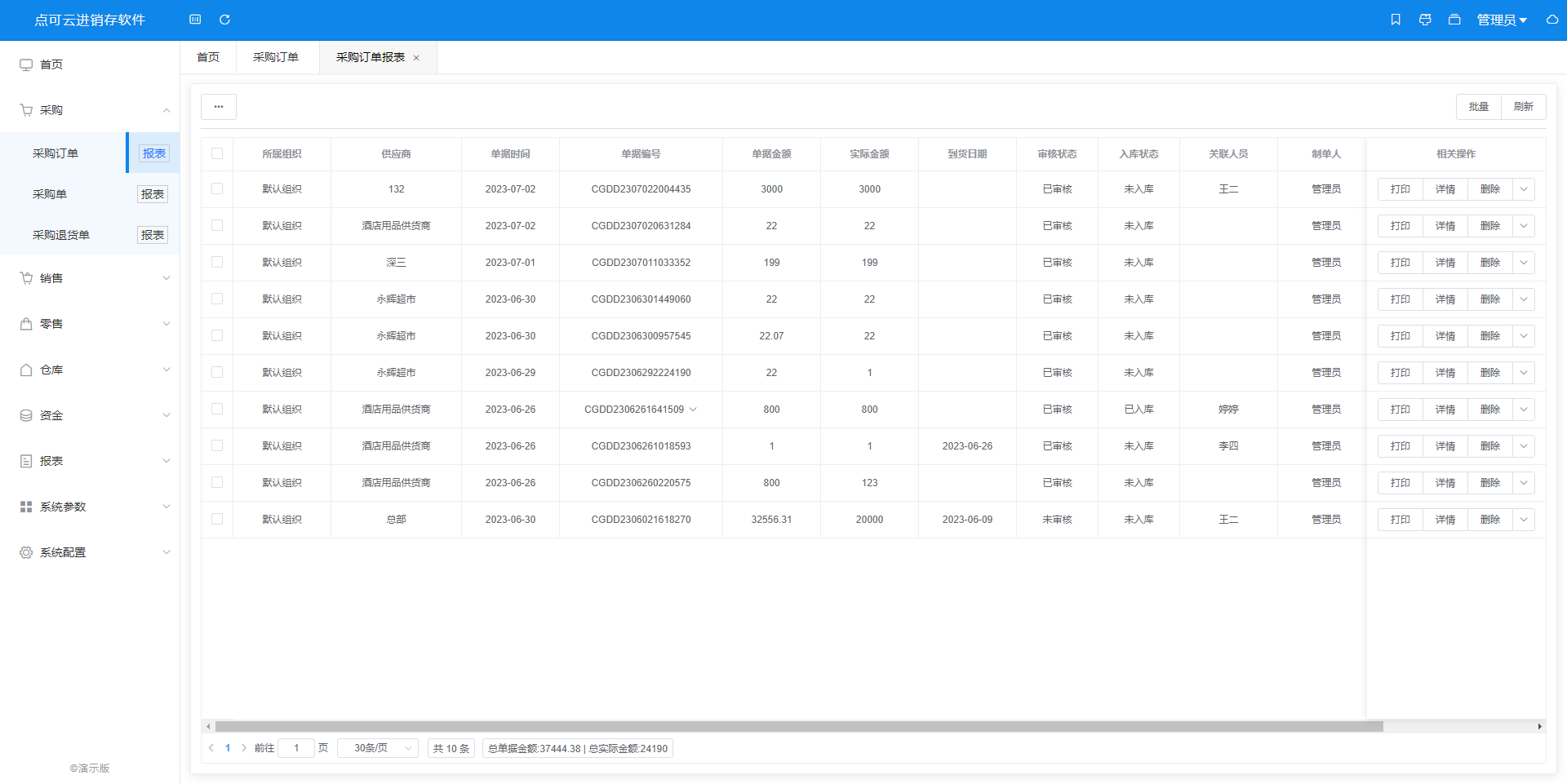 综上所述,点可云进销存软件提供采购订单管理功能,包括采购订单单据和采购订单报表。采购订单单据可填写商品信息和必要数据,并支持保存、审核和生成采购单等操作。采购订单报表包含了所有保存的采购订单,支持多维度搜索和多项单据操作,方便进行批量审核、打印、删除等操作。我们提供方便易用的界面和操作方式,让您的采购订单管理更加高效和便捷。