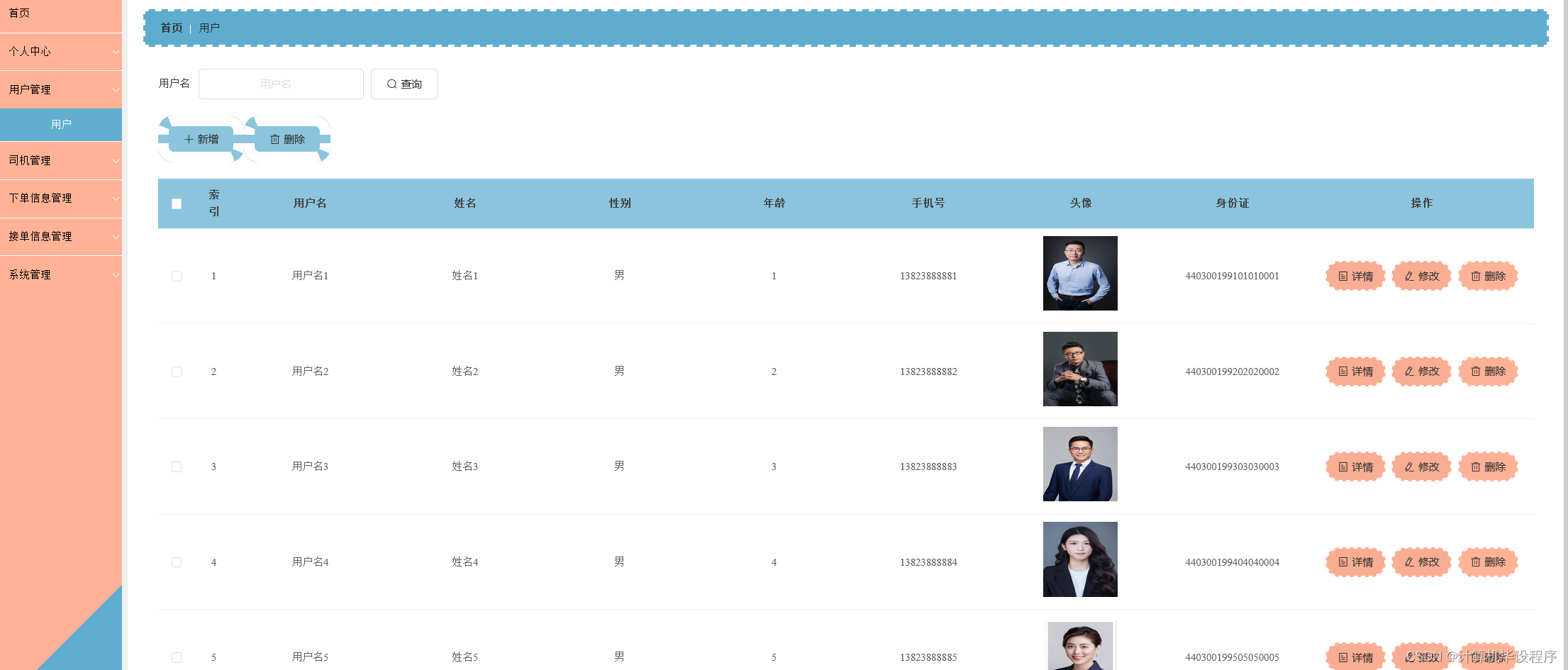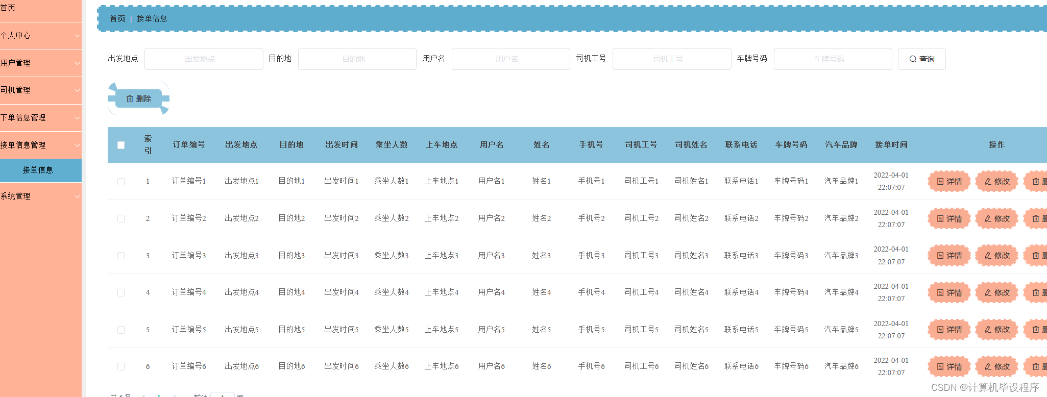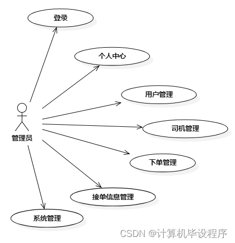 管理员:登录、个人中心、用户管理、司机管理、下单管理、接单信息管理、系统管理。