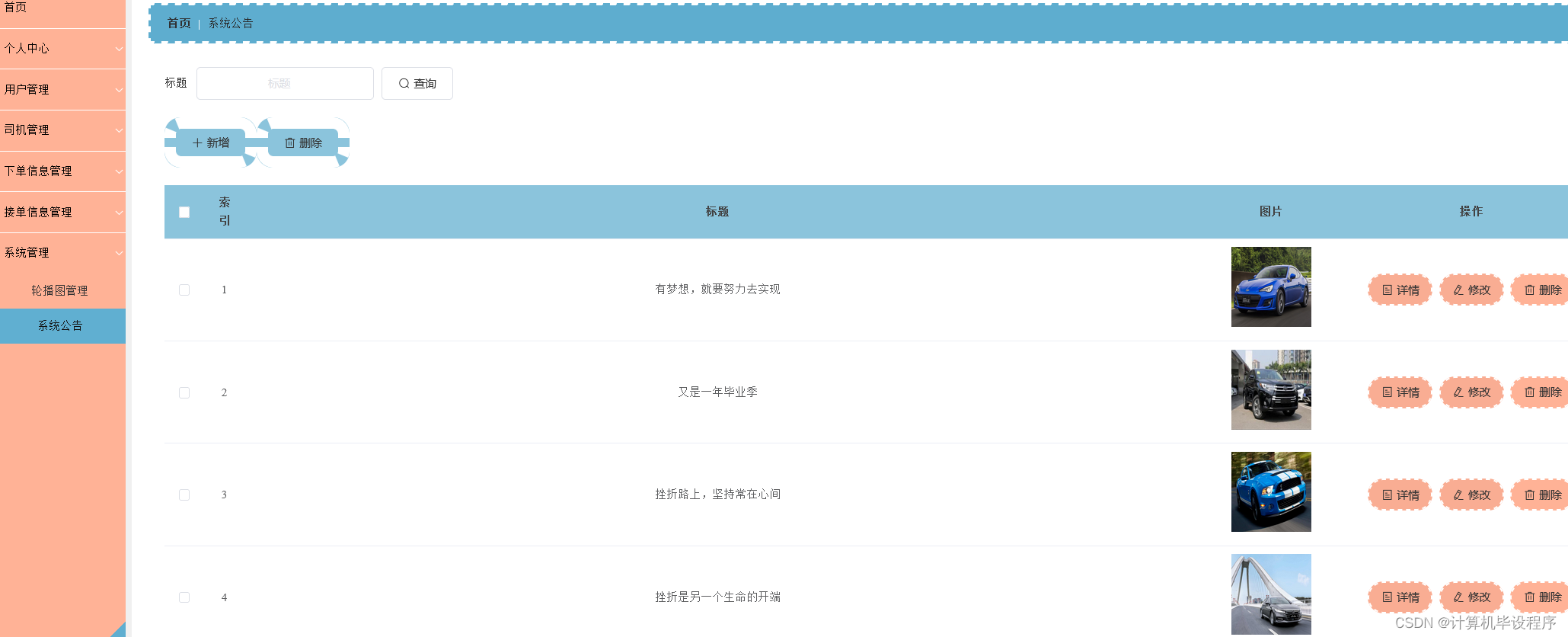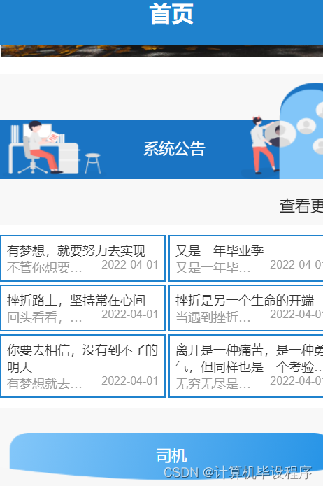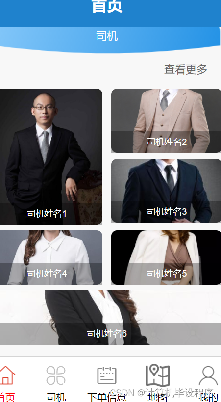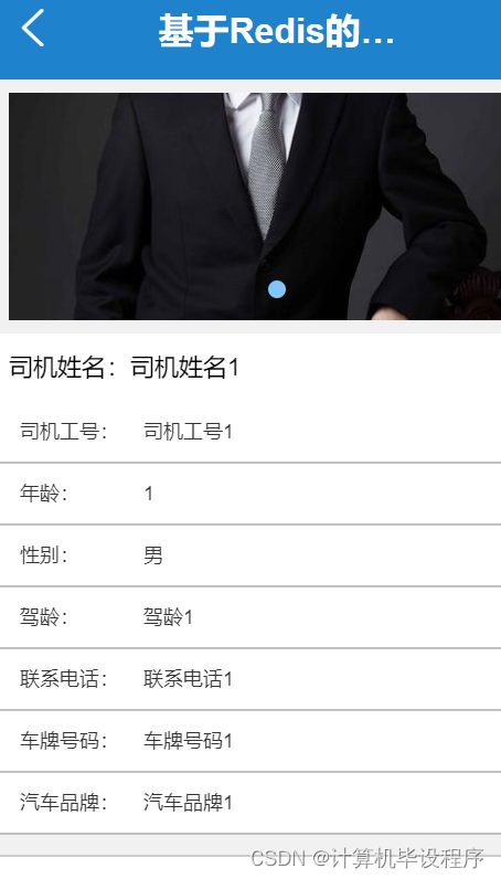 在展示的界面上显示了司机的相关资讯,用户可以点击司机的图片,就可以查看司机的详细资料。必须在前面的接口中用 CSS风格来修饰网页,在风格标记中定义 CSS风格。脚本风格中有很多的处理功能,用户在点击司机的图片时,会有一个功能的对应用户的要求,跳跃到司机细节页面。