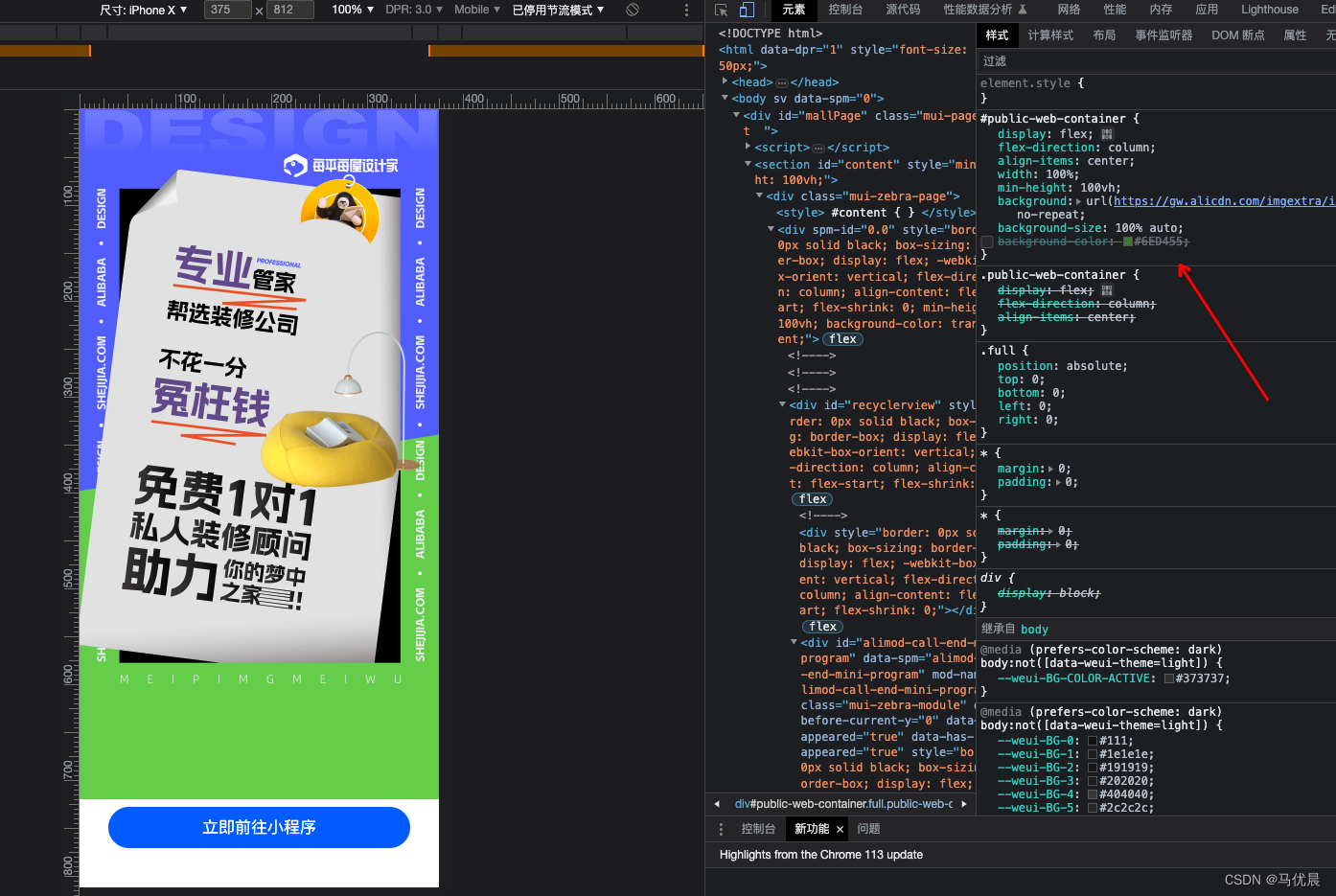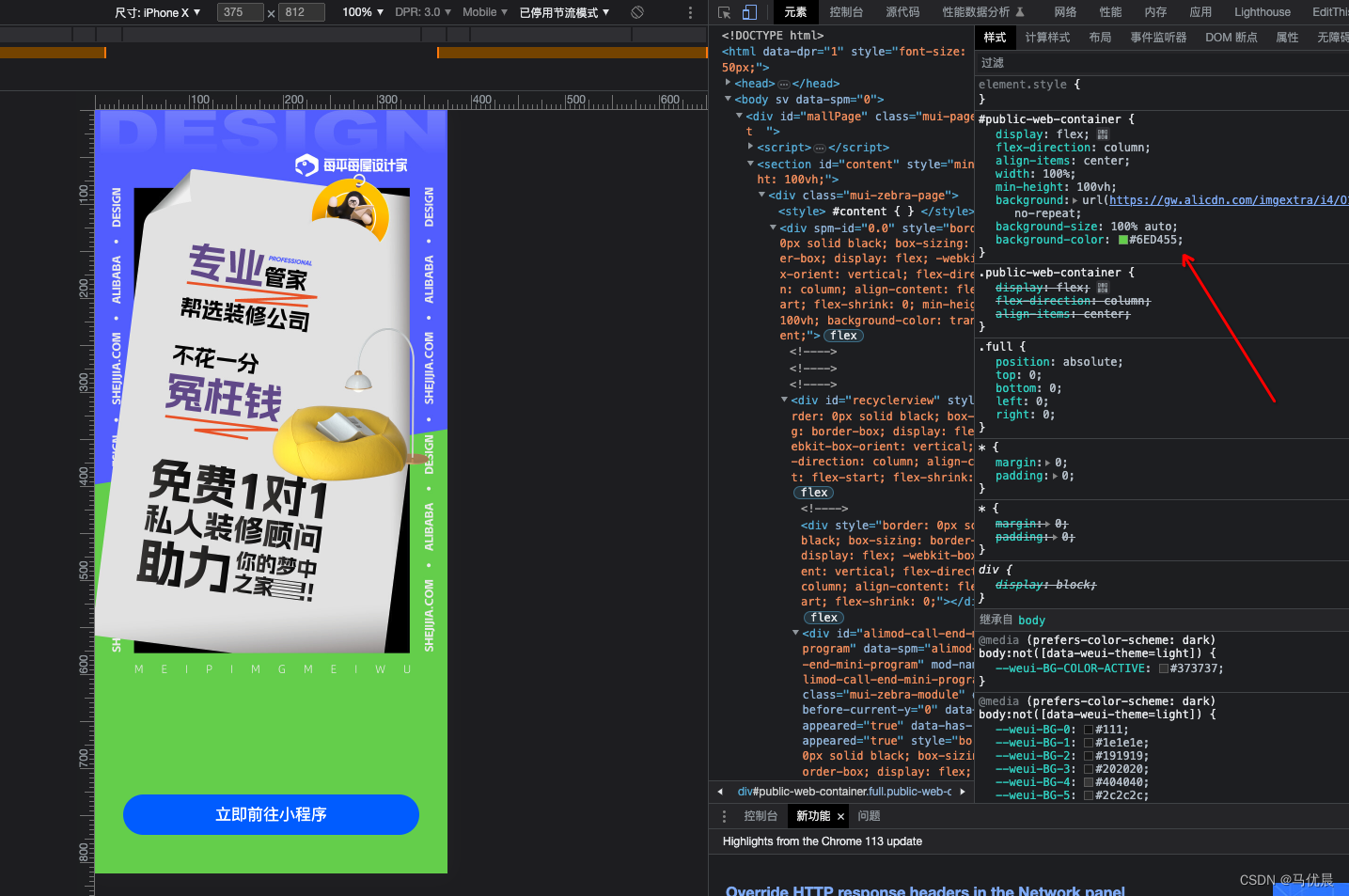 #public-web-container {display: flex;flex-direction: column;align-items: center;width: 100%;min-height: 100vh;background: url('xxxxxxxxx') no-repeat; // 这里的图片按照750或者375的尺寸设计background-size: 100% auto;background-color: #6ED455;