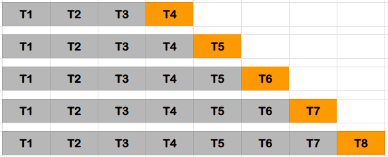 如上图所述,对于第一个迭代,第一个3行被视为训练数据,下一个实例T4是验证数据。 选择训练和验证数据的机会将被进一步迭代。