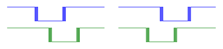 让我们将一个完整的周期定义为一个以中性状态开始和结束的过程。通过分配 0 表示没有移动,+1 表示向右移动四分之一,-1 表示向左移动四分之一,我们得到 +4 的总和表示向右一个完整的周期,-4 的总和表示一个完整的循环循环向左,总和为 0 表示没有移动。特别是,每个单独的开关弹跳,无论是向左还是向右,总和为 0,对结果没有影响。此外,聚合和 4 的模数为我们提供了确切的状态。例如,如果模数为零,则当前状态为中性状态。
