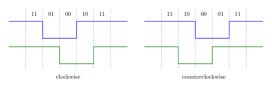 原则上,常见的旋转编码器通过交替闭合两个开关来产生信号,如上图所示。根据连接,中性状态可以是高 (1) 或低 (0)。我们在这里假设中性状态为高的最常见连接。对于顺时针运动,第一个开关的动作先于第二个开关的动作,而逆时针运动则相反。如果我们将每个状态表示为二进制数,两位数字表示两个开关的状态,则中性状态表示为11, 顺时针旋转由状态链表示11→01→00→10→11逆时针旋转由状态链表示11→10→00→01→11.