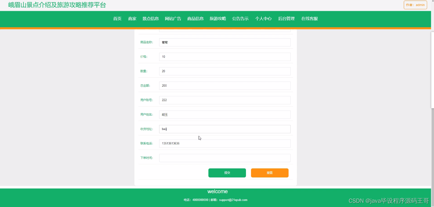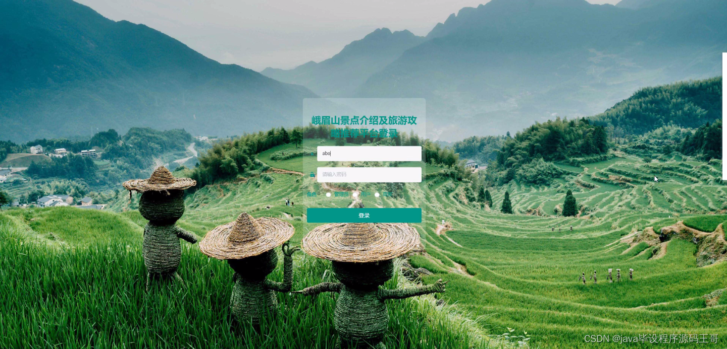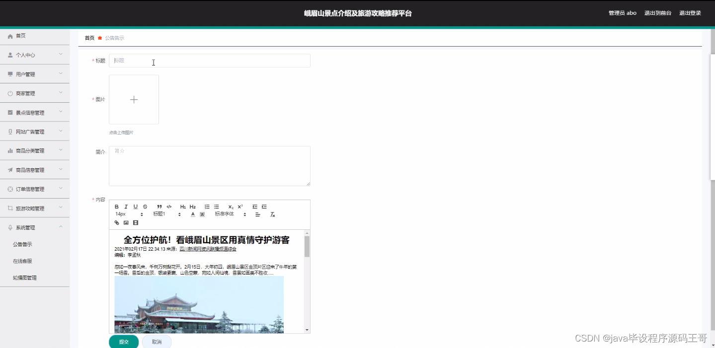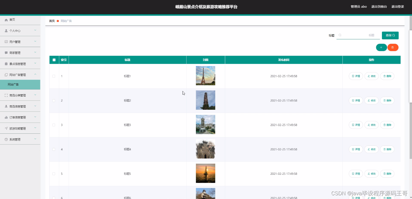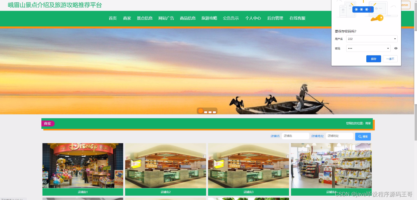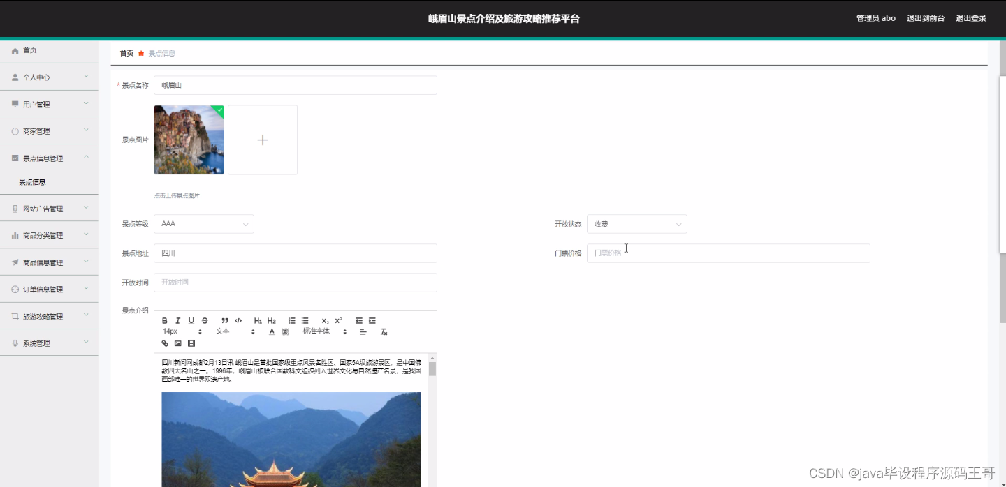 - 设计并开发一个峨眉山旅游攻略推荐平台,实现用户管理、商家管理、景点信息管理、网站广告管理、商品分类管理、商品信息管理、旅游攻略管理等系统功能。