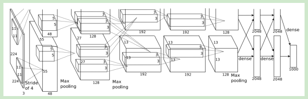 AlexNet是(首届ImageNet竞赛)ILSVRC2012的冠军,由Alex Krizhevsky等人提出,错误率首次达到15.4%。AlexNet创新:使用ReLU激活函数;使用dropout;大量使用数据扩充技术。AlexNet极大地震动了计算机视觉领域,使人们意识到卷积神经网络的优势,促使深度学习和卷积神经网络的爆发性增长。