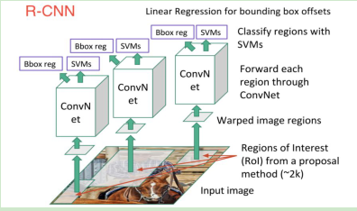 R-CNN基本思路:输入一张图片,通过指定算法从图片中提取2000个类别独立的候选区域;对每个候选区域,用CNN获取一个特征向量;对每个区域相应的特征向量,用支持向量机(SVM)进行分类,并通过一个bounding box regression调整目标包围框的大小。