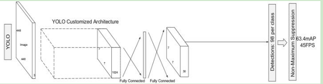 YOLO基本思路:将输入图像划分成7*7的网格;对每个网格,都预测2个边框;根据上一步可预测出7*7*2个目标窗口,根据阈值去除可能性比较低的目标窗口,由NMS去除冗余窗口。YOLO主要构成:卷积层,目标检测层,NMS筛选层。