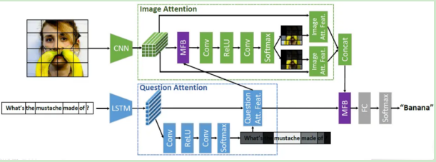 - 联合嵌入方法(joint embedding approaches),即学习视觉与自然语言的两个不同模态特征在一个共同的特征空间的嵌入表达(embedding)。Zhou Yu等人[23]提出MFB模型,使用一种端对端深度学习网络设计了一种“co-attention”(双重注意)机制,实现同时在图像和问题上学习,并将MFB模型和双重注意学习结合成一个专门针对VQA开发的网络模型。