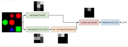 - 组合模型(compositional models)。把模型分解为模块的组合的方法,模块化有利于任务分解,重用等。Jacob Andreas[24]等人提出NMN模型,该模型将问题进行语义分析,得到语法树,然后使用特定的模块来代替树的每个节点,最后构成一个总模型。