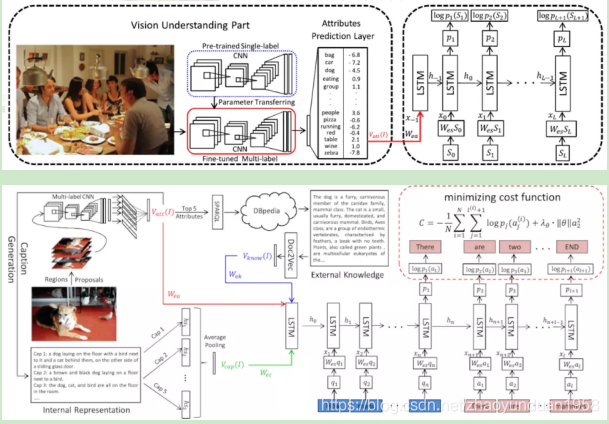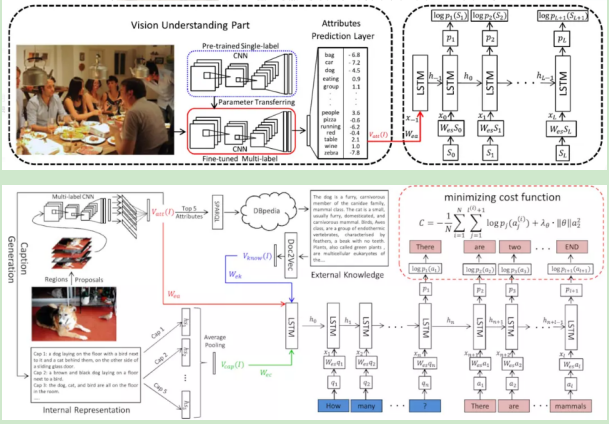 - 知识增强方法(knowledge base-enhanced approaches)。该法结合图片以外额外知识,如关于某个词的描述,作答。Qi Wu[25]等人将综合Attributes(从图片captions中提取)和External Knowledge(属性相关描述)转化的向量,得到最终答案。