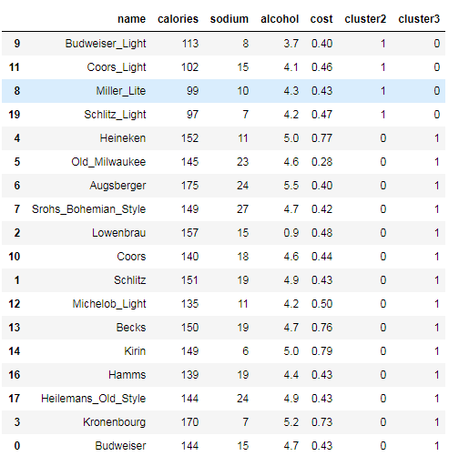 X = beer.iloc[:,1:] # ["calories","sodium","alcohol","cost"]