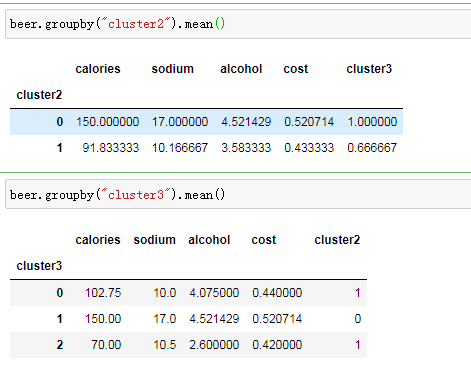 #当k=3时聚类结果: [0 0 0 0 0 0 0 0 2 2 0 2 0 0 0 1 0 0 1 2]beer["cluster2"] = km2.labels_