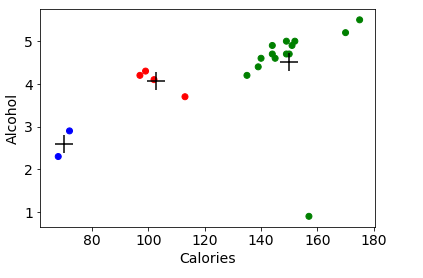 plt.scatter(beer["calories"], beer["alcohol"],c=colors[beer["cluster3"]])plt.scatter(centers.calories, centers.alcohol, linewidths=3, marker='+', s=300, c='black')plt.xlabel("Calories")