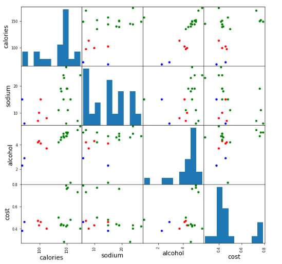 scatter_matrix(beer[["calories","sodium","alcohol","cost"]],s=100, alpha=1, c=colors[beer["cluster3"]], figsize=(10,10))